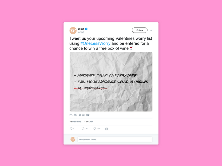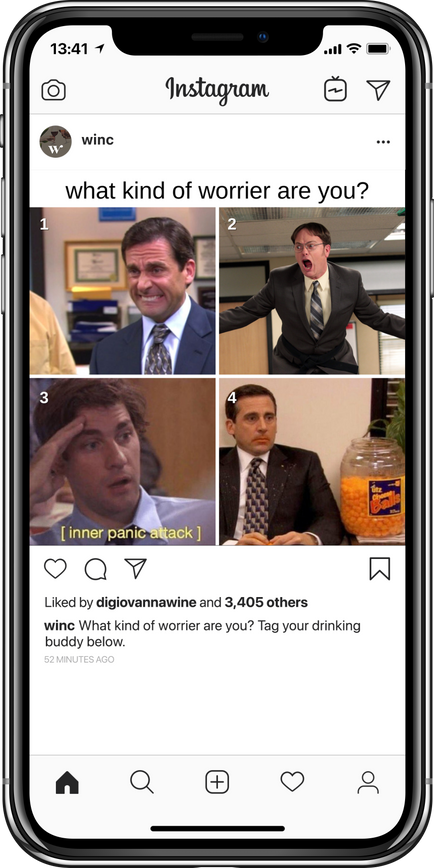 Using both Twitter and Instagram as the contest platforms, Winc will get their customers to submit their own worry list for a chance to win a free month's subscription: a box of 4 hand-selected bottles of wine based on their preferences and results in a personal questionnaire. The funniest and most relatable to both Millennials & Gen Z submission wins.